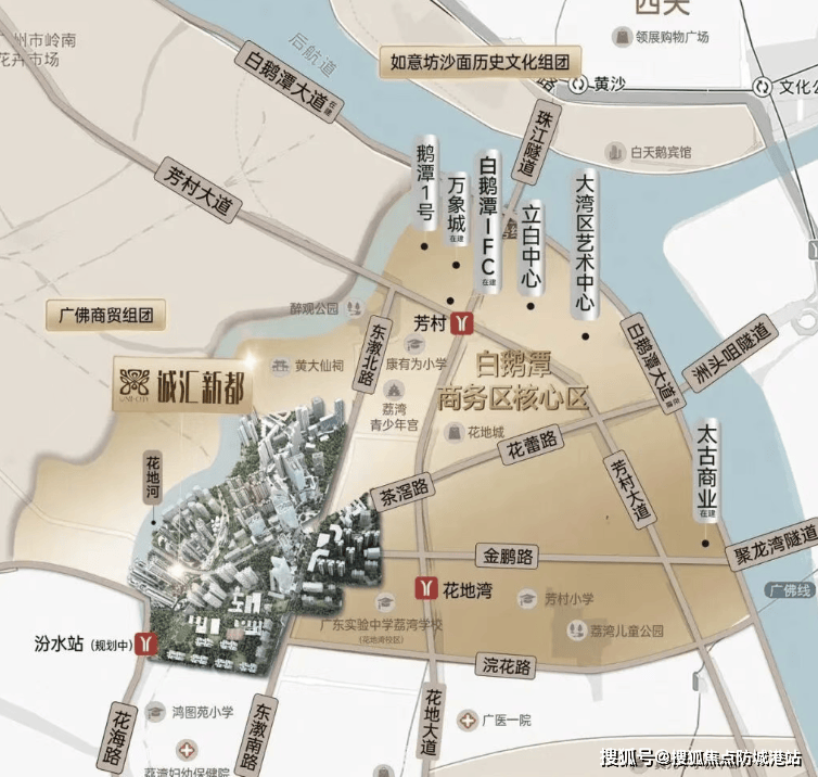 广东省西医院芳村病院、广州西医药大学第三从属病院等病院也距离项目不远,项目周边的公交线较为丰硕,努力于打制一个集总部办公、高端贸易、生态人居为一体的城市糊口3.0大城。还有鸿猷苑小学、以及六大丛林从题园林的设想,